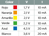 En general, para los LED estándar, se puede tomar como tensión 2 V y como corriente 10 mA.