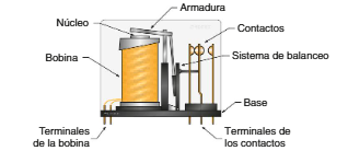 El relé es un dispositivo electromagnético compuesto por una bobina y contactos. Al aplicarse tensión a la bobina, su núcleo atrae un sistema mecánico que mueve los contactos, abriendo los cerrados y cerrando los abiertos. Cuando se interrumpe la tensión, los contactos regresan a su posición original gracias a un resorte.